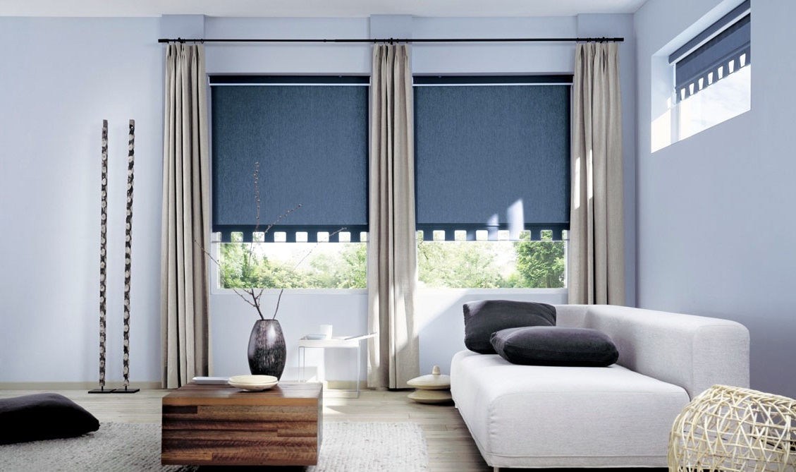 sinie rulonnye shtory iz tekstilya v